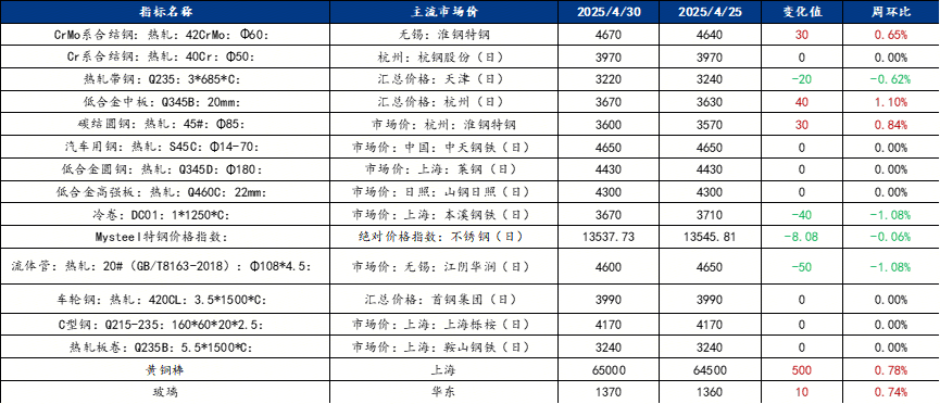 30日国内钢材指数(Myspic)综合指数报收123.52点,周环比上涨0.19% 。供应方面,本周五大钢材品种供应883.69万吨,周环比增加7.85万吨,增幅0.9%。库存方面,本周五大钢材总库存1447.1万吨,周环比降87.17万吨,降幅5.7%。消费方面,本周五大品种周消费量为970.86万吨,环比增加4.8%;其中建材消费环比增8.3%,板材消费环比增2.6%。本周五大品种表观消费呈现建材板材双增的局面。铜市方面:宏观方面,关税与政府改革导致美国一季度GDP增速转负;4月非农数据显示就业市场仍有韧性,但二季度存在回落风险;日央行应对关税不确定性推迟降息步伐。基本面方面,上周铜价震荡运行,价格偏弱,不过整体较稳,目前铜价支撑仍强。铝市方面:上周铝价整体偏弱,小幅下跌。本周重点关注库存去化速度、关税豁免细则及美联储货币政策信号,预计沪铝主力合的核心运行区间在19500-20500元/吨。