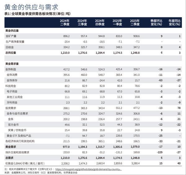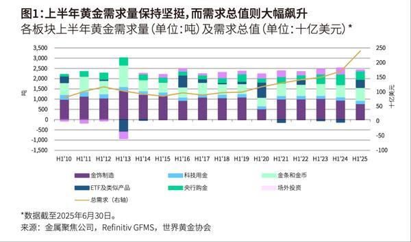 7月31日,世界黃金協會發佈的2025年二季度《全球黃金需求趨勢報告》顯示,在高金價環境下,二季度全球黃金需求總量(包含場外交易)達1249噸,同比增長3%;以價值計,全球黃金總需求同比大幅躍升45%,達到1320億美元,創歷史紀錄。